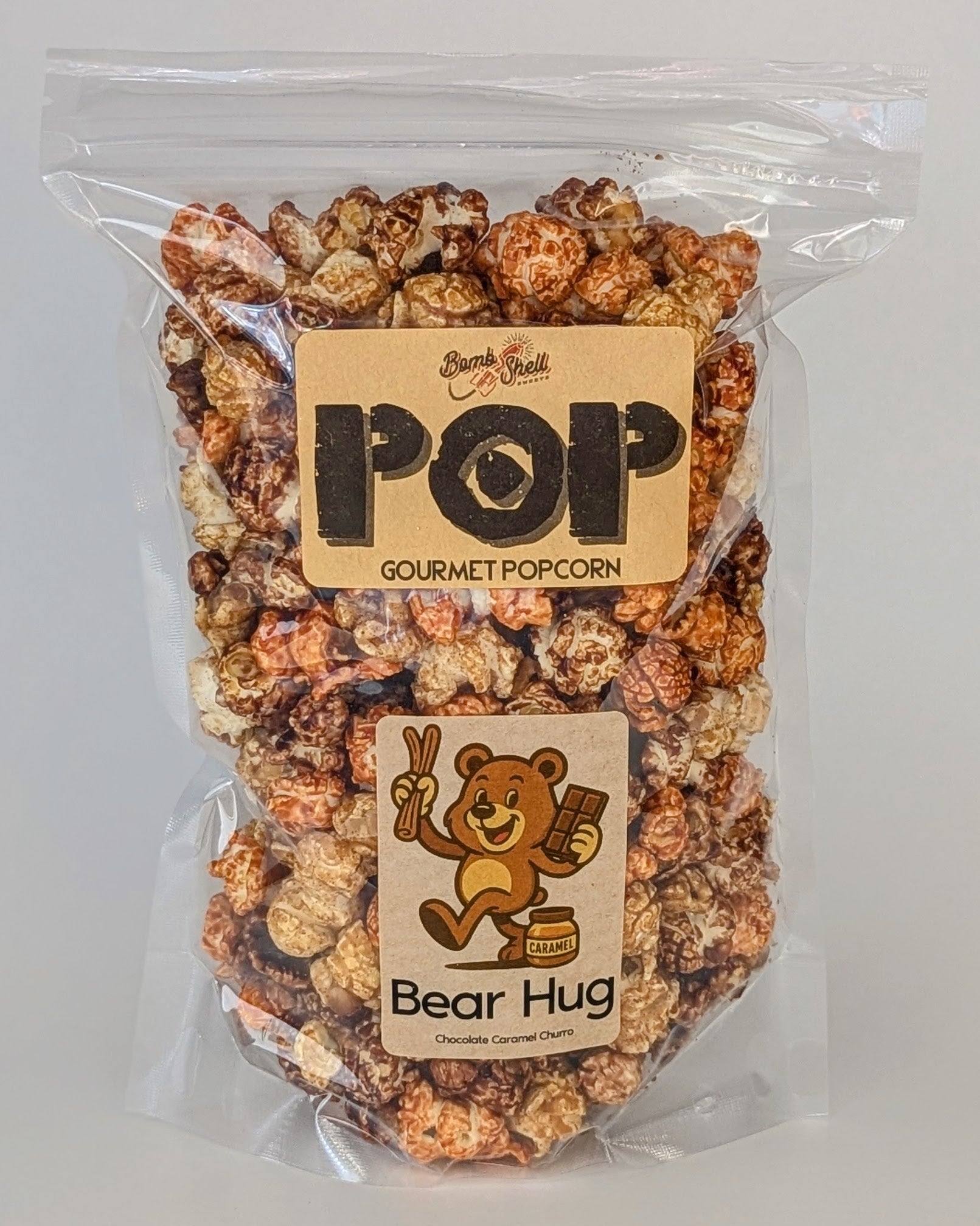 Three flavors, one irresistible embrace. Bear Hug layers the warmth of churro, the buttery sweetness of caramel, and the richness of chocolate onto fluffy popcorn. The tri-colored mix of cream, light brown, and dark brown kernels creates a striking visual that matches the big, cozy flavor experience.