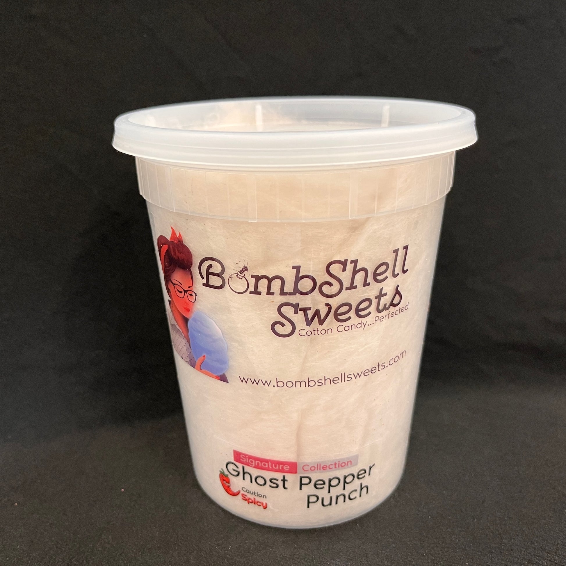 Ghost Pepper Punch cotton candy is a bold fusion of tropical fruit sweetness and fiery heat. The cotton candy has the airy, fluffy texture you'd expect, but with an unexpected kick. The tropical fruit punch flavor brings in juicy notes of pineapple, mango, and citrus, creating a refreshing, vibrant base. Then comes the punch of spice from ghost pepper, adding a lingering, intense heat that contrasts with the sweetness. The result is a thrilling combination of fruity brightness and a fiery kick that builds as you savor it, leaving a lasting impression on the taste buds.