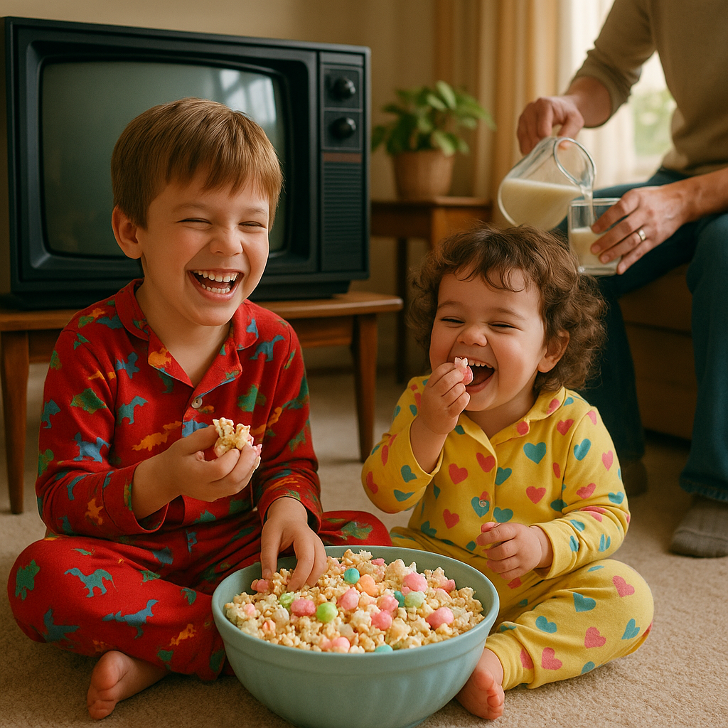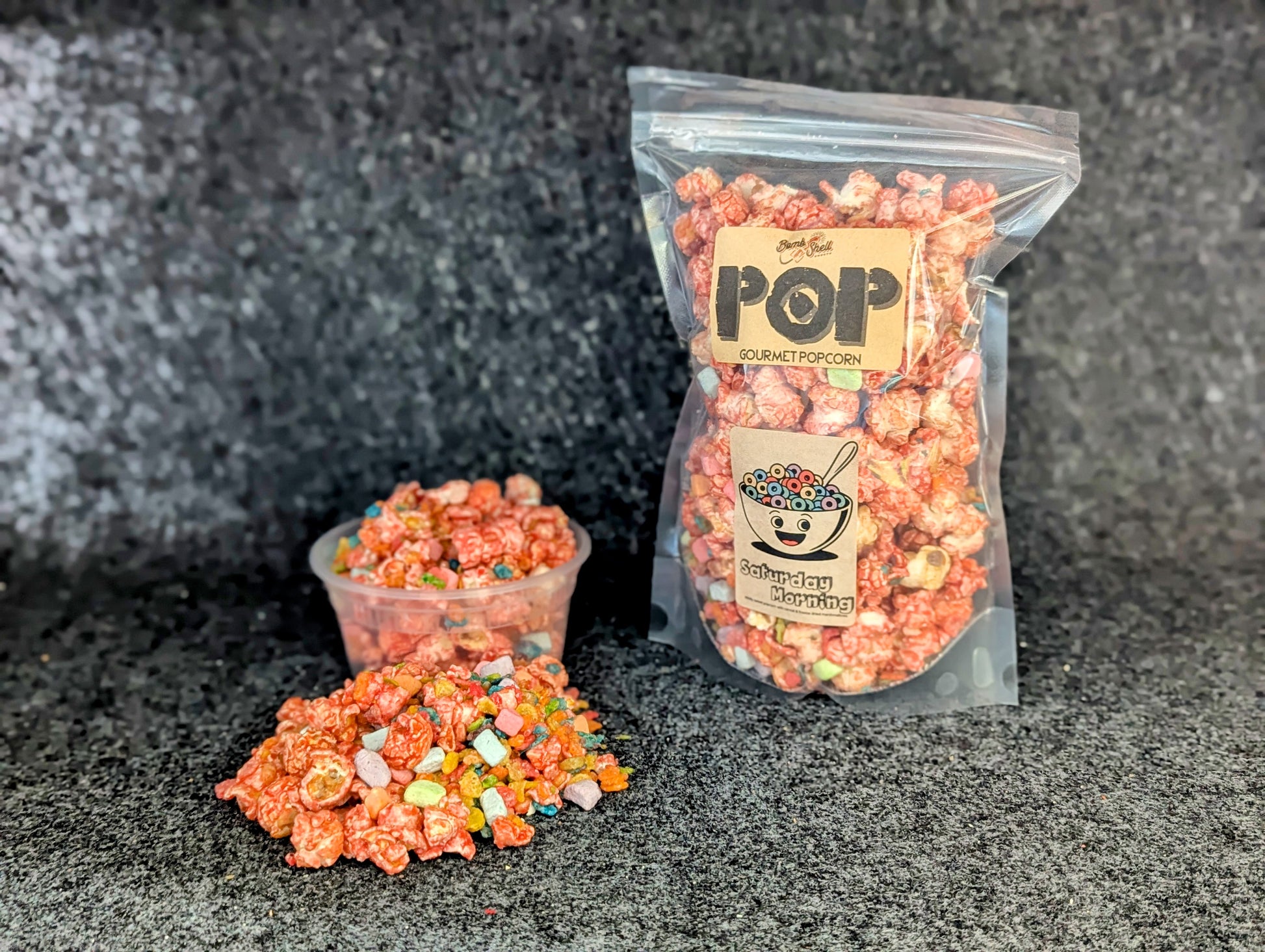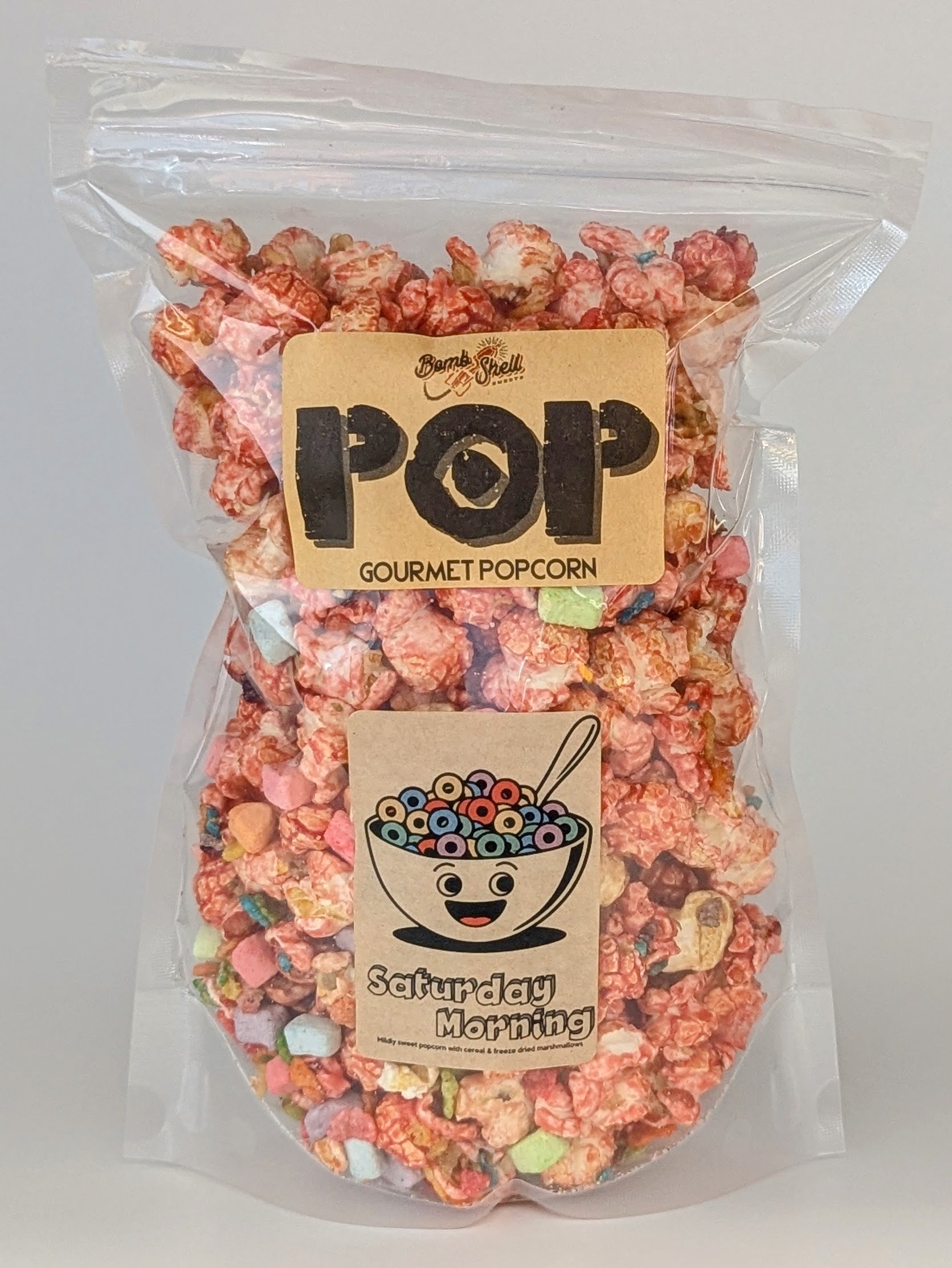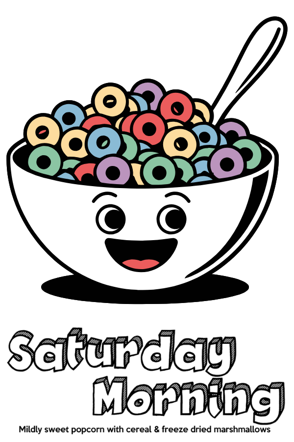 Nostalgia in a bag, Saturday Morning popcorn is inspired by lazy cartoon-filled mornings and sugary cereal bowls. Fluffy pink popcorn is tossed with crunchy Fruity Pebble cereal and dotted with freeze-dried marshmallows for a sweet, colorful crunch. It’s a playful mix of texture, flavor, and memory — the perfect treat for kids at heart.